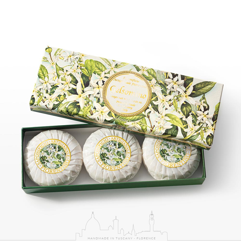 茉莉花精緻而柔美,是一種帶有甜美香氣的花朵,喚起寧靜。這些高品質的肥皂包裹在精緻的褶皺遊戲中,描繪了佛羅倫薩百合,藝術和美麗的象徵。溫和的保濕作用將使您的皮膚光滑而芬芳,非常適合全天感覺清新。