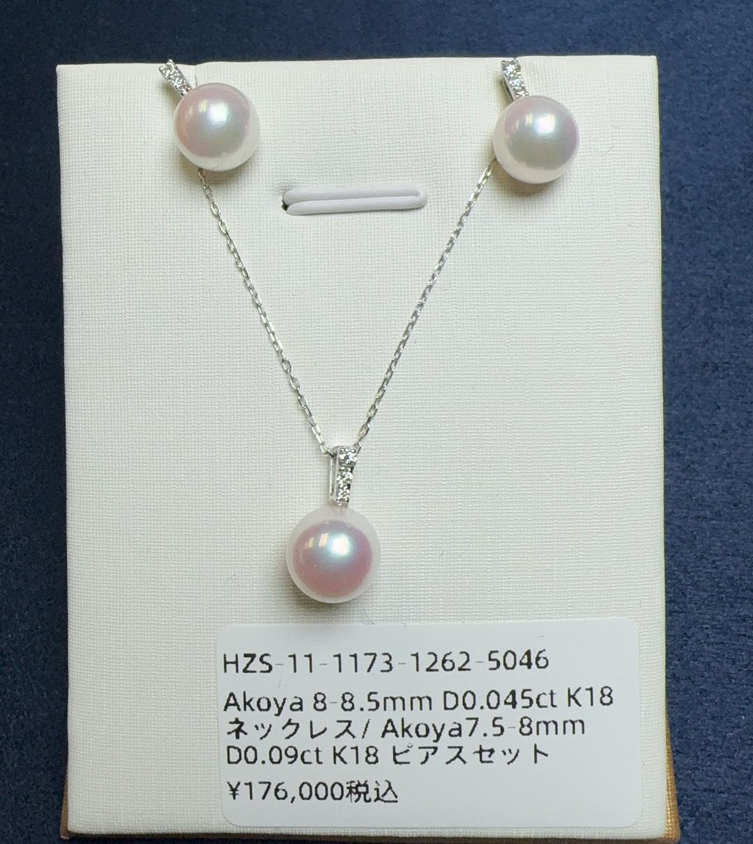 Tasaki同款的珍珠首飾,3鑽系列是屬於經典爆款系列 ,珍珠點位大小也可以根據客人喜好進行私人定制 ,三鑽垂直排列 拉長頸部線條 ,鑽石閃亮吸睛 。 圖片每顆珍珠的直徑在 8- 8.5mm和7.5-8mm之間,項鍊上點綴0.045克拉的鑽石,耳環上的鑽石克拉數高達 0.09克拉。 整體的材質選用了高貴的K18白金,保證了首飾的質感和品質。