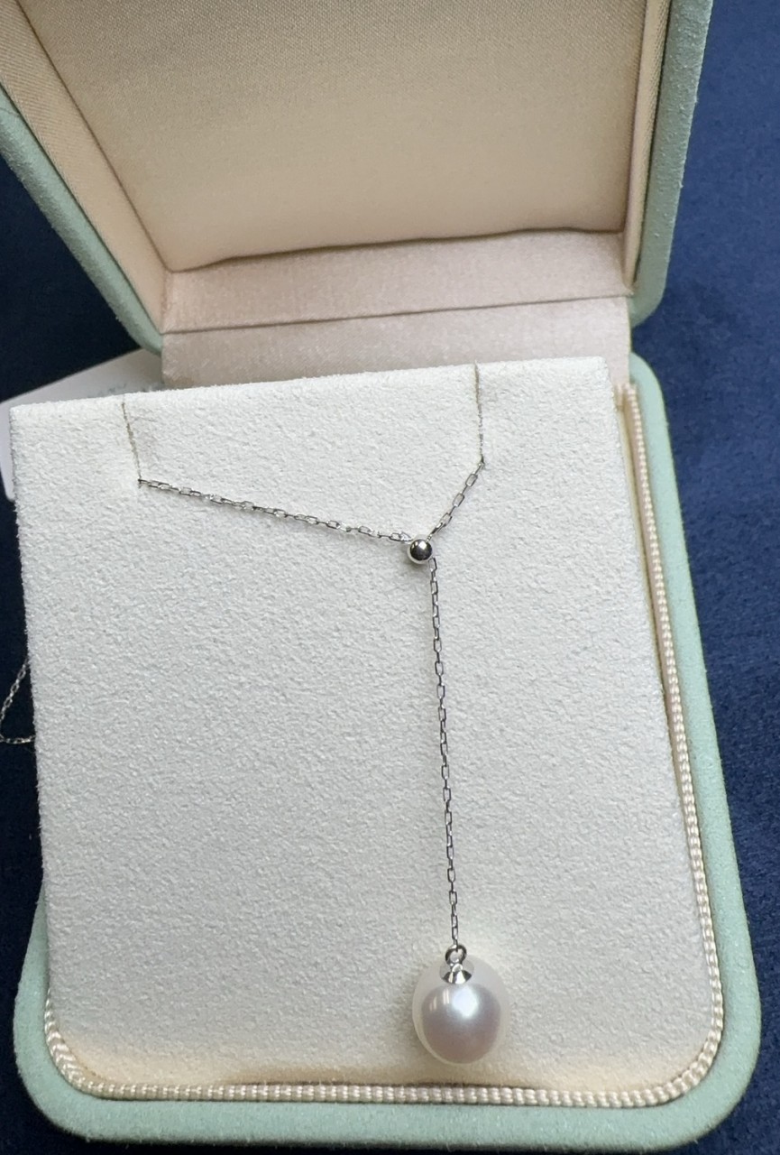 這款Y字項鍊採用了Akoya珍珠,每顆珍珠點位在 8-8.5mm之間,大小適中,閃耀著迷人的光 澤。 項鍊材質為18K黃金,鏈長45公分。 採用了Y字鏈的設計,不僅增加了項鍊的美感,還使得配戴更顯優雅和大氣。 更特別的是,前置的珍珠可以隨意調整到您喜歡的位置,讓您可以根據不同的穿搭風格自由搭配。
