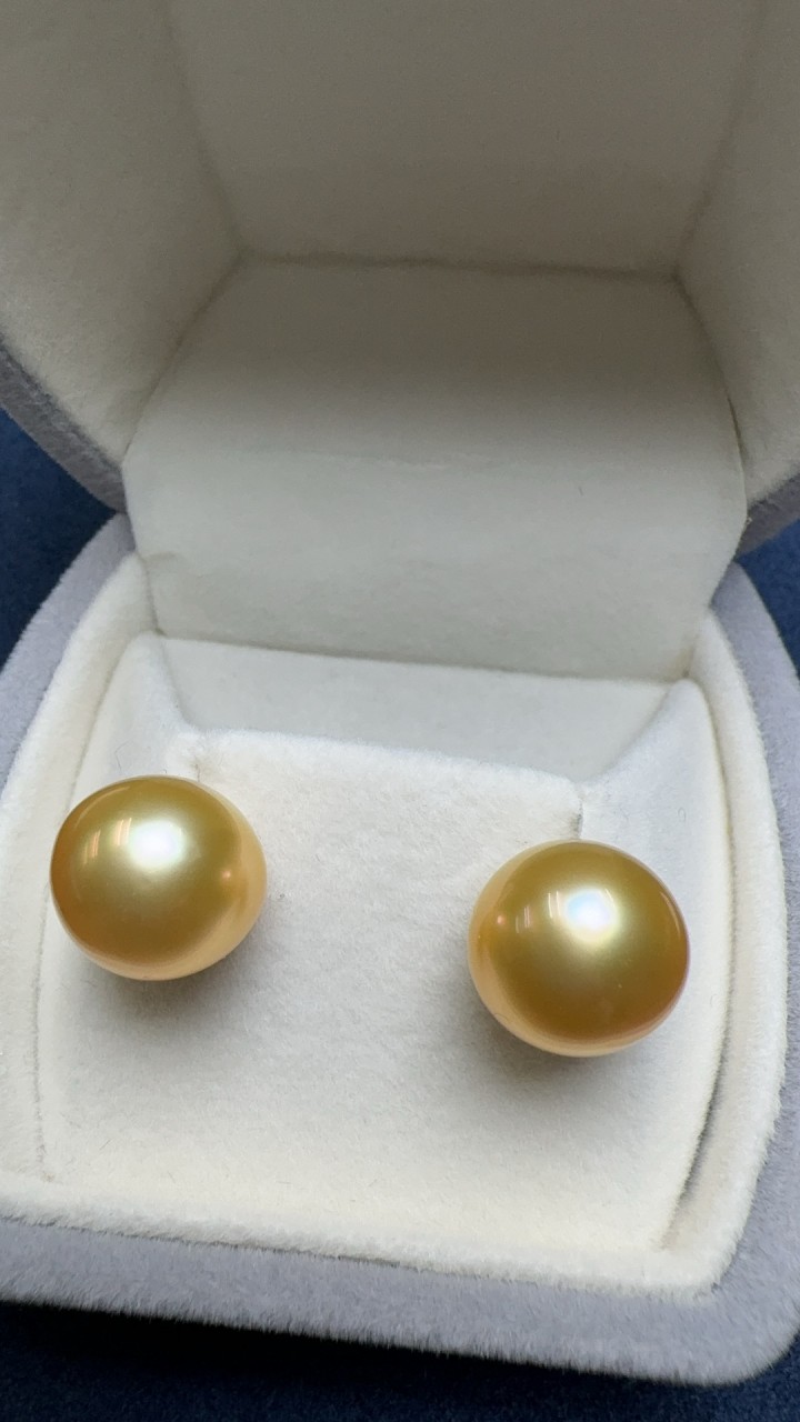 這款耳環同樣採用了南洋金珠 ,呈現出獨特的金色光澤,展現出高貴與典雅。 金色珍珠的罕見性使其成為珍貴的飾品,每顆珍珠都是獨一無二的 。 K18黃金耳針為整體造型增添了一抹奢華。