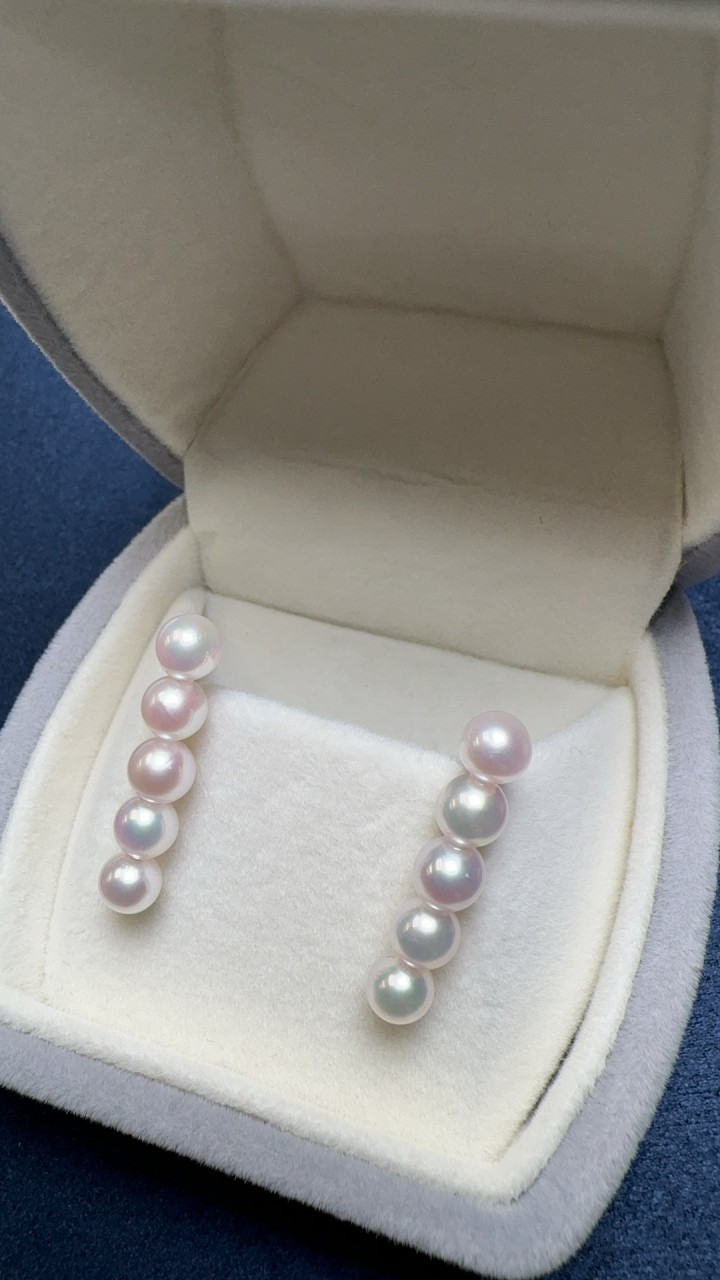 這款耳環由五顆5-5.5mm的Akoya珍珠相間而成,每顆珍珠都經過精心挑選,表面光滑潤澤,珠光閃爍。 耳環整體造型簡約清新,搭配K18黃金耳針和耳堵,展現高雅品味。
