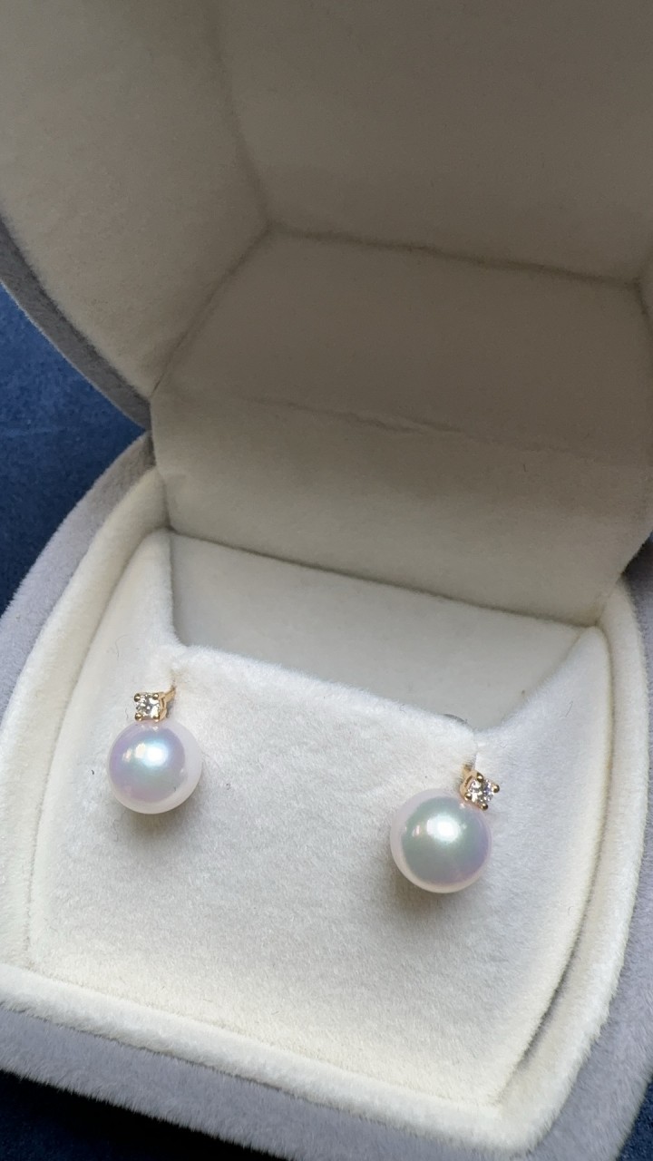 戴妃等級的7.5-8mm Akoya珍珠,這款耳環在簡約中展現奢華 。 每顆珍珠都完美無瑕 ,與鑽石的點綴相得益彰,散發出獨特的魅力。 K18黃金耳針與耳堵精湛工藝,展現品質。