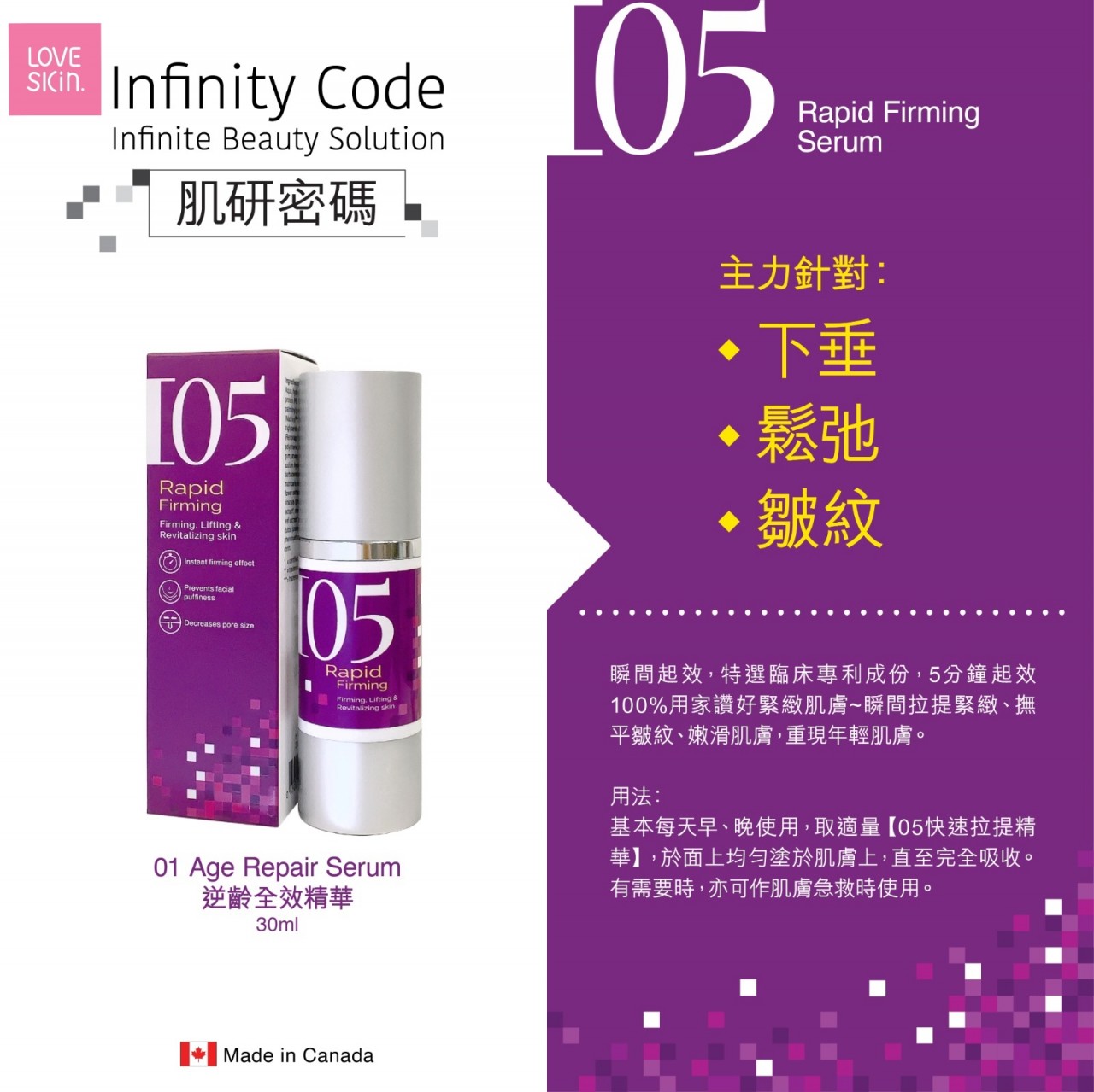 主力針對下垂鬆弛皺紋專利有效成份Seaflash™改善肌膚6大問題,平滑,拉提,緊緻,抗皺,保濕,柔軟。Matrixyl®增加骨膠原,令肌膚回復彈性,減少皺紋~用法:於清潔肌膚後,將適量【05快速拉提精華】於面上均勻塗抹,尤其腮骨及頸部位置,直至精華被吸收。建議每天、晚使用。