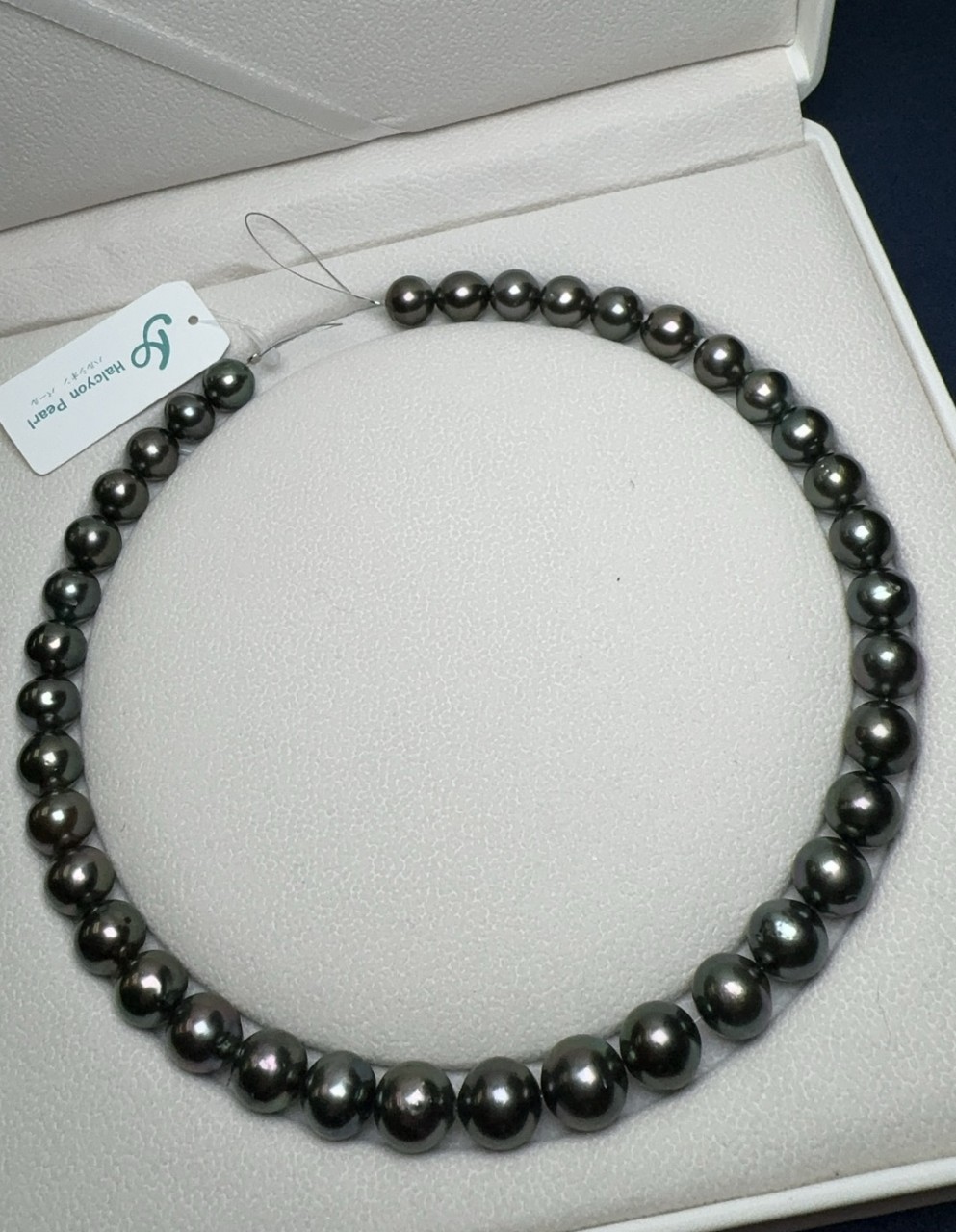 這條項鍊的大溪地珍珠尺寸在 10.1mm到12.0mm之間,每顆珍珠都經過精心挑選,確保表面微瑕疵 ,但仍然保持了迷人的光澤和質感。 每顆珍珠的形狀都是正 圓對稱的,各個點位均勻,鍊長為42cm,可與各種領型的服飾搭配,是日常配戴的理想選擇。